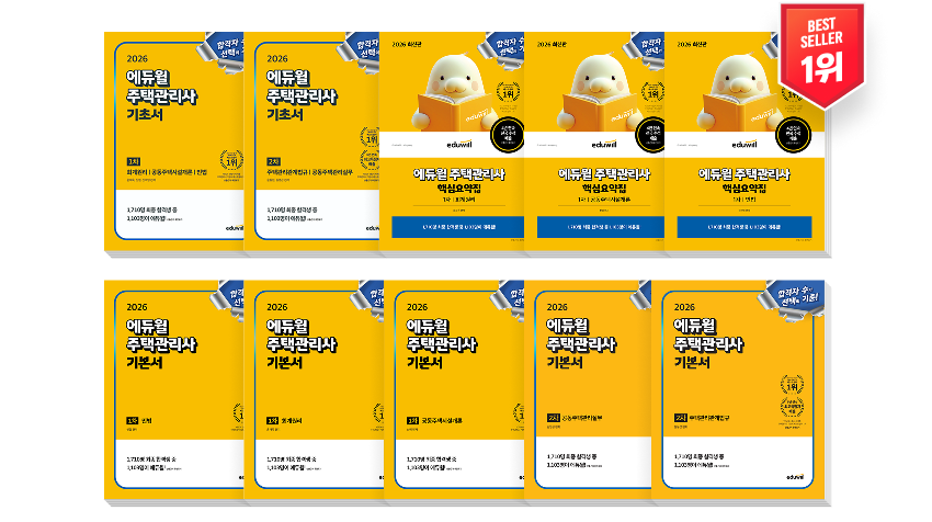 *2020년 23회 2차(최종) 시험 원서접수 이벤트 및 풀서비스 시 수험번호를 입력한 수강회원 (1,103명), 한국산업인력공단 합격자 공고 합격률 기준 추산한 인원 포함 1,600명 예상 *[4년 연속 전국 수석, 7년 연속 최고 득점자] 2025년, 2024년, 2023년, 2022년 전국수석합격 및 공동주택관리실무 최고득점 / 2021년, 2020년 주택관리관계법규, 공동주택관리실무 과목별 최고득점 / 2019년 주택관리관계법규 최고득점 *[압도적 1위] 주요 4개 업체 간 카카오데이터트렌드 주간 검색량 비교 결과 (2021.06.01~2021.12.31) *[역대급 환급금] 2022 에듀윌 주택관리사 환급금 과거 연도 비교 결과 *[사상 최대 합격자 수] 2022 에듀윌 주택관리사 합격자 수 자체 집계 결과 *[248% 증가] 21년 대비 22년 에듀윌 주택관리사 환급액 증가율 기준 (2023.02.01 기준)